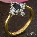 Custom two-tone ring with 950 platinum settings and an 18k fairmined yellow gold reversely tapered round domed shank. (1) 6-Prong set customer provided marquise cut blue center stone with additional stones prong set around the diamond shaped halo. The halo is comprised of (1) GLJW provided marquise cut diamond melee at the north and south ends, (2) customer provided round cut diamond melee at the east and west ends, and an additional (4) customer and (4) GLJW provided round cut diamond melee prong set between the NSEW stones. All with a high polish finish.