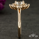 Rose gold halo set with a center round diamond, Split shank -Halo has graduating diamond sizes set around the halo with a diamond set in the V opening.