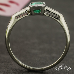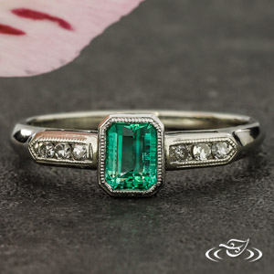 An emerald is bezel set with milgrain is accented by bead set diamond shoulders in this classic engagement ring.