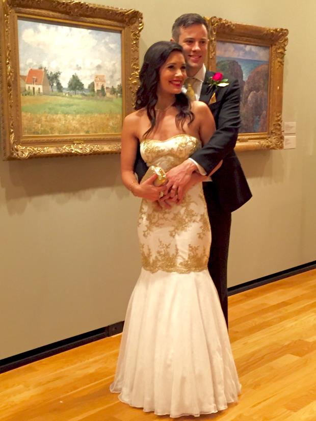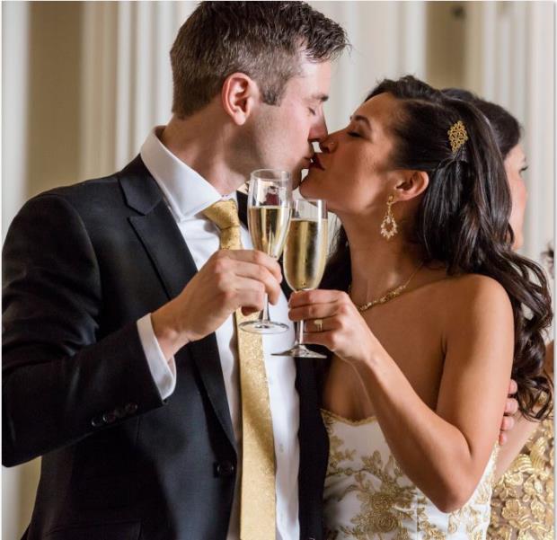 The gorgeous couple on their wedding day, decked out in beautiful gold, just like her ring!