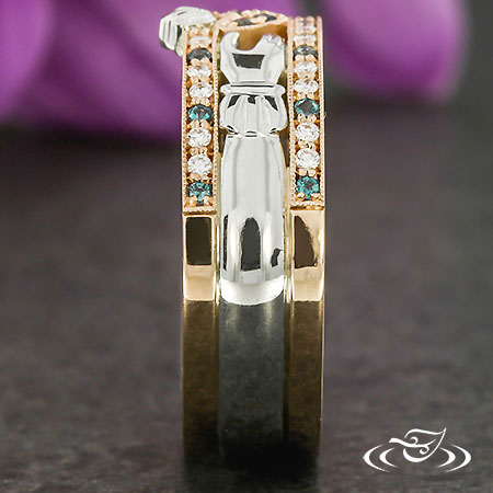 Alexandrites and diamonds accent this two tone claddagh engagement ring with milgrain rose gold heart and rails.