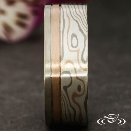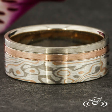 8mm Mokume-Gane wedding band with 5mm section of Rose/White Gold/Silver. (2) sections of off center rose and white gold with grooves between. 8mm total width, finger size 10