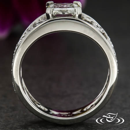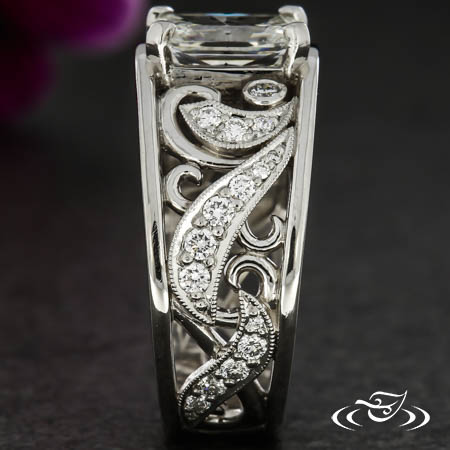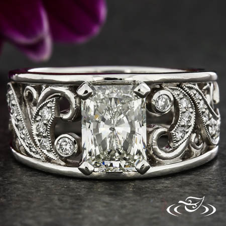 This platinum band holds a radiant cut diamond in square prongs and elegant pave and filigree curls between two side rails.