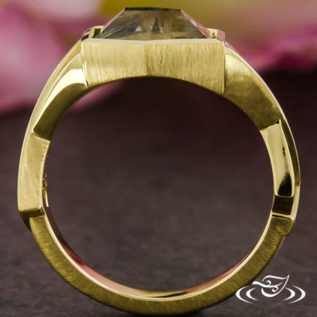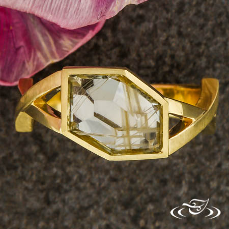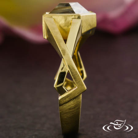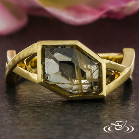 Custom 18kt fairmined yellow gold ring holding a 3.38ct bezel set geometric shaped rose cut white Montana sapphire center stone with rutile inclusions. The stone is set on top of a high polished 950 platinum plate which has been installed into the base of the bezel setting. The round shank has a geometric twisted design on each side of the ring while a solid tapered domed band comprises the bottom third. The shorter strand on each side of the twisted shoulders is high polished while the remainder of the ring has a brushed matte finish.