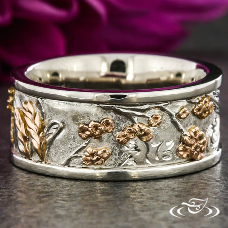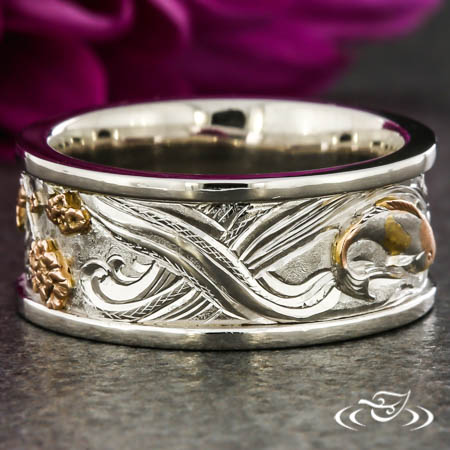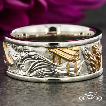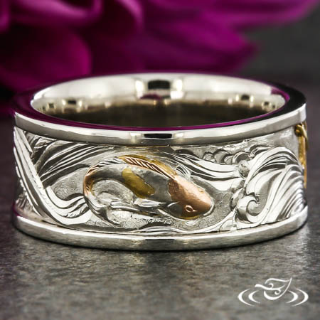 Custom 950 platinum band with a flat comfort fit profile and raised high polished side rails. Set along the recessed background between the rails is a cast in place Koi fish and branch motif. 18k Yellow gold and 14k rose gold inlay elements set into the fish. As well, 14k rose gold ginger blossoms and leaves and 14k rose gold cherry blossoms assembled onto the existing branches and a gate with an 18k yellow gold roof and 14k rose gold pillars assembled between the fish and the leaves. Hand engraved wave patterning covers the remaining blank space with hand engraved Japanese characters set within the cherry blossoms. The recessed background has a matte finish while all the raised details are high polished.