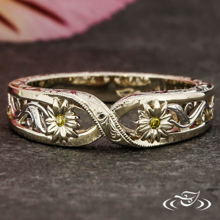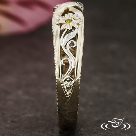 Custom 14kt fairmined white gold band with (1) twist at the top of the shank. (1) Open panel extends halfway down both sides of the ring both starting at the top twist. (1) Cast in place flower sits at the top of each open panel each holding (1) flush set GLJW provided round cut yellow diamond melee. Hand fabricated filigree curls and leaves fill the remaining open spaces. (1) GLJW provided round cut diamond melee bead set into each end geometric detail, (1) on each lower end of the pierced panels. Hand engraved scroll patterning extends eternity style around both side faces and wraps around the top face of the twist. This band has a round tapering profile with milgrain edges and a high polish finish.