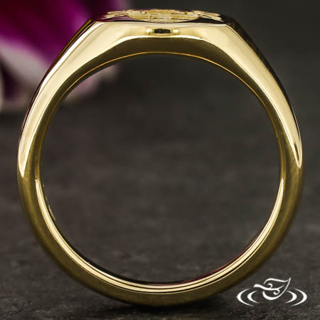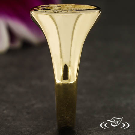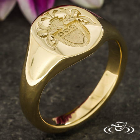 Custom 14k fairmined yellow gold signet ring with cast in place recessed family crest on the oval flat top face. The crest has hand engraved detailing. The remainder of the ring has a round domed shank with a tapered profile and a high polish finish.