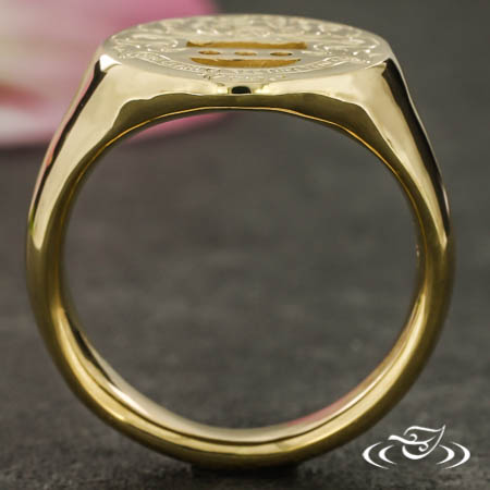 Custom 14kt yellow gold family crest signet ring with an oval shaped flat top face and a tapering round domed shank. The matte finished top face has a recessed 3D shield with hand engraved animal and scroll detailing to match the family crest. Below is a hand engraved banner reading "DUM CLARUM RECTUM TENEAM" and "Penn" hand engraved below that. The shank has a high polish finish.