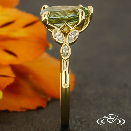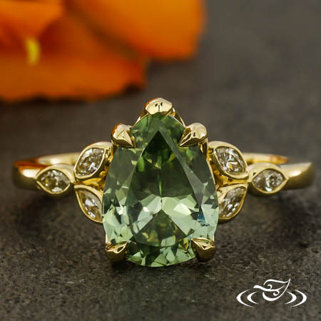 Custom 14kt yellow gold ring holding a prong set GLJW provided pear sapphire center stone with (6) GLJW provided bezel set marquise lab diamonds, (3) on each side. There is a flower shaped under gallery. This ring also has a round curve taper shank and a high polish finish.