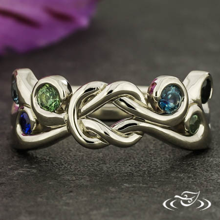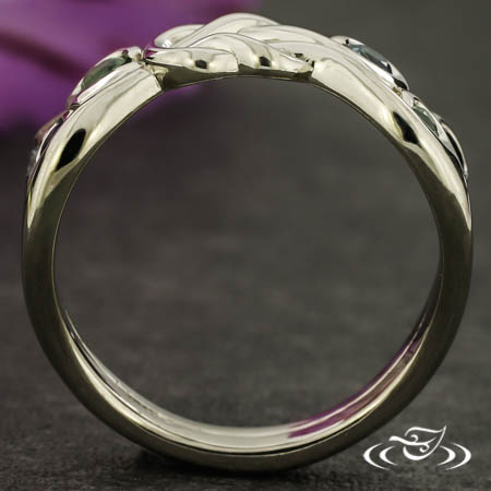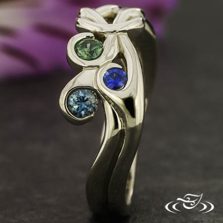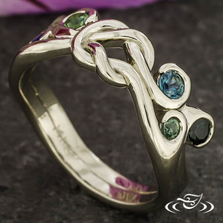 Custom 14kt warm white gold nautical inspired memorial ring with a pierced sailor's knot in the center. The shoulders of the ring each have (3) cast in place curls which each hold (1) wrap set GLJW provided round cut blue-green Montana sapphire melee. The remainder of the ring has a round softly domed shank with (1) central groove along the top face. All with a high polish finish.