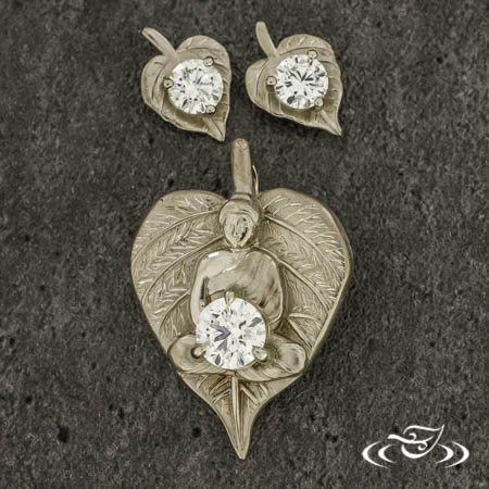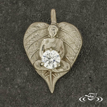 Custom 14kt warm white gold leaf shaped pendant with a CAD/cast in place raised Buddha in the center. The Buddha is holding (1) 3-prong set customer provided round cut diamond center stone. At the top of the pendant is (1) hand fabricated bail that is made to appear as the stem of the leaf. This pendant has a sandblasted finish with high polished raised veins and hand engraved bright cut veins on the leaf.