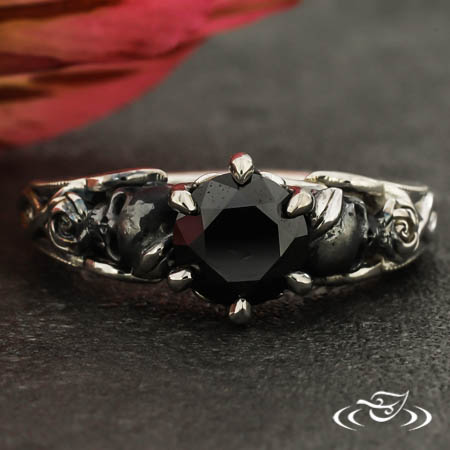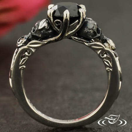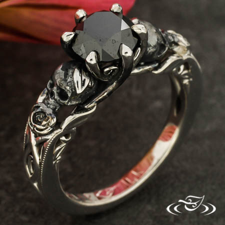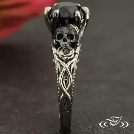 Custom 14k warm white gold ring holding (1) GLJW provided round cut lab diamond center stone 6-prong set with delicate pointed prongs. (1) Sterling silver CAD/cast oxidized skull is assembled at the top of each shoulder. The shank has a cast in place rose, curl, leaf, and pierced infinity knot motif along the top half of the top and side faces. (1) Hand fabricated filigree curls fills all (4) pierced openings of the infinity knots. The bottom half of the ring has a hand engraved scroll and leaf pattern. This ring has a round shape, milgrain edges, and mixed finish.