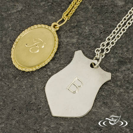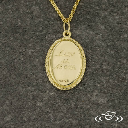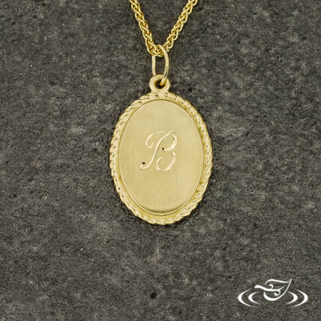 Ordered (1) 14k yellow gold 21.64x12.11mm oval shaped pendant with metal rope detailing as a halo. The front face has a brushed matte with with a hand engraved a "B" in a stylized script font. The back face is high polished with "Luv u Mom" hand engraved in (3) rows of script font. This pendant has (1) jump ring bail at the top and strung onto a GLJW supplied 14k yellow gold wheat chain.