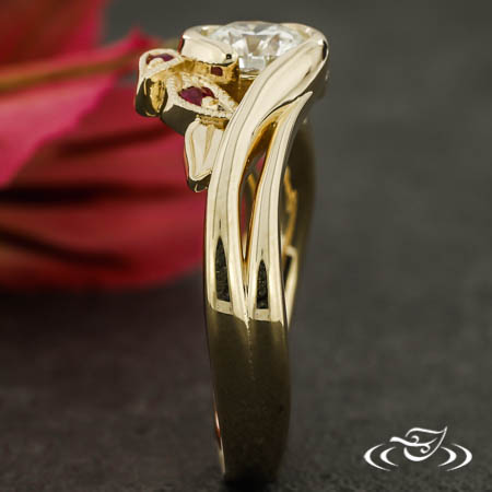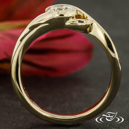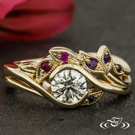 Custom 14kt yellow gold ring holding (1) wrap set GLJW provided round cut diamond center stone. Cast in place leaf motif wraps around half of the center setting with the vines of the leaves tapering into the remainder of the round shank. Each leaf holds (1) bead set GLJW provided round cut sapphire melee and is edged in milgrain. The stones are set in the order of (2) pink sapphires, (2) purple sapphires, and (2) blue sapphires. All with a high polish finish.