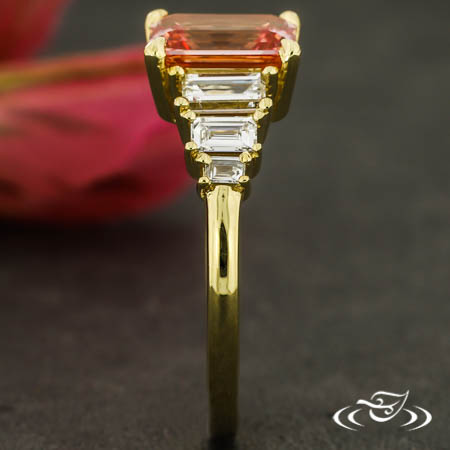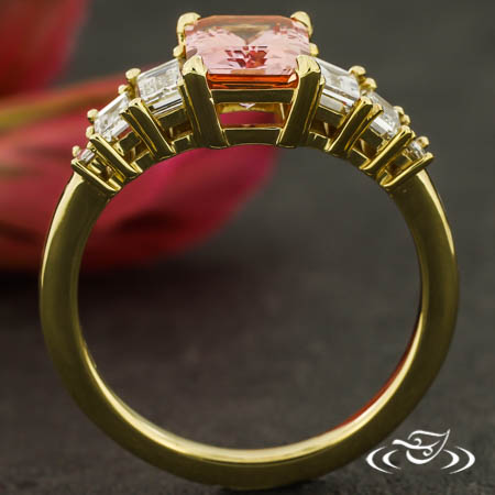 Custom 18kt yellow gold ring holding (1) 4-prong set GLJW provided radiant peach lab sapphire center stone. Ring features (3) GLJW-provided baguette lab diamond melee 4-prong set on each shoulder with smallest stone towards the bottom of the shank. This ring also has a round shank and a high polish finish.