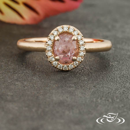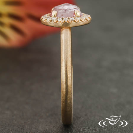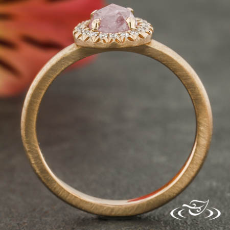 14k rose gold ring featuring rose cut pink Montana sapphire surrounded by halo of french set diamonds totaling .08ctw. Matte finish.