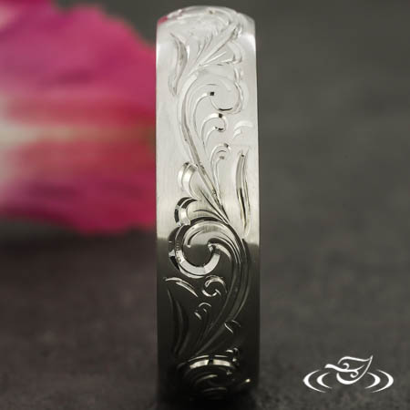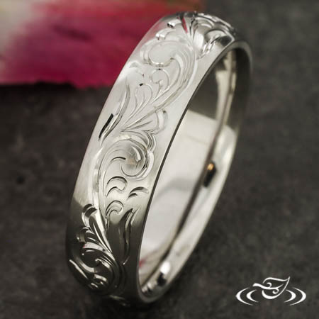 Custom 950 platinum comfort fit band with a round domed profile and a brushed matte finish. This band has hand engraved scroll patterning eternity style around the top face.