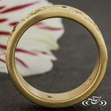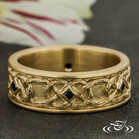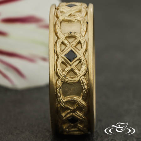 Custom 14kt yellow gold band featuring CAD-and-cast raised Celtic pattern with tree bark texture eternity style around entire top face with raised rails to either side. (6) GLJW provided princess black diamond melee are bezel set equidistant across band in center of knot motifs. This band also has a round shank, flat comfort-fit profile, and a matte finish.