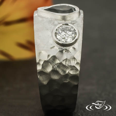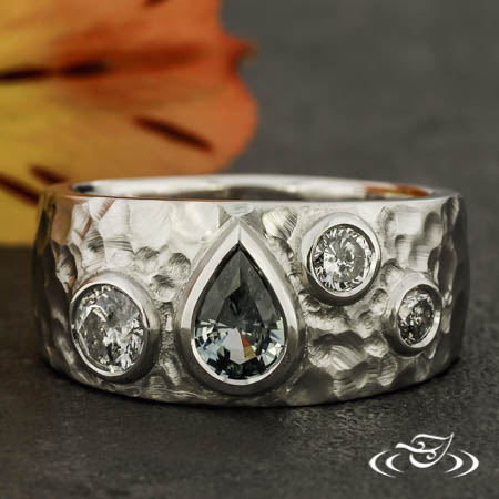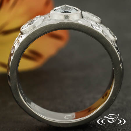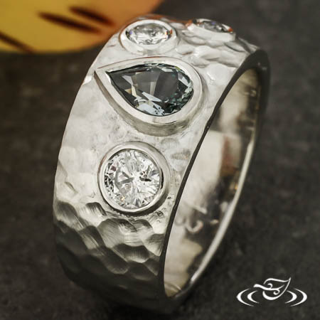 Custom 950 platinum band holding (4) stones bezel-set on top face spaced closely to each other in the following order: (1) customer provided round diamond stone, (1) bezel set GLJW provided pear sapphire center stone, and (2) customer provided round diamond stones. The bezels are high polish. This band also has a round, straight-taper shank, flat comfort-fit profile, and a matte hammered finish.