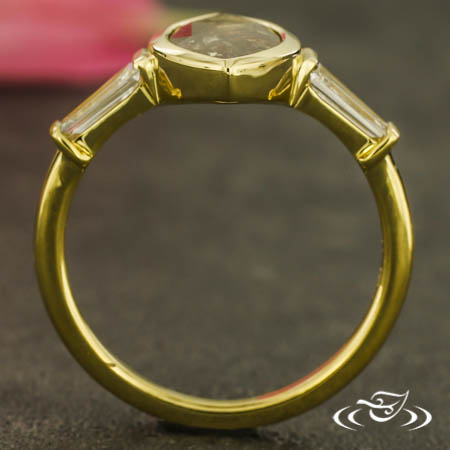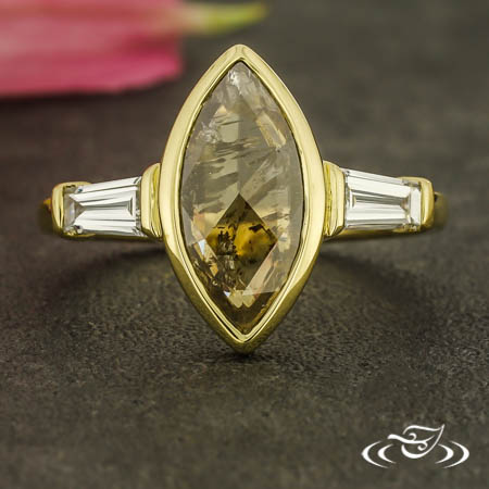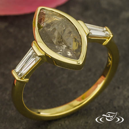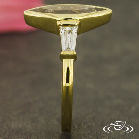 18kt yellow gold ring holding (1) bezel set marquise cut brown rustic diamond center stone flanked by (2) tapered baguette lab diamond stones channel set on top face. All with high polish finish.