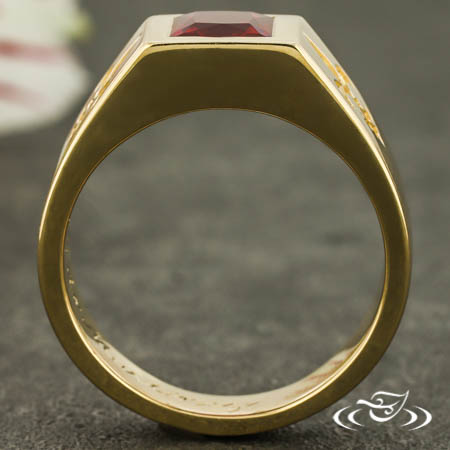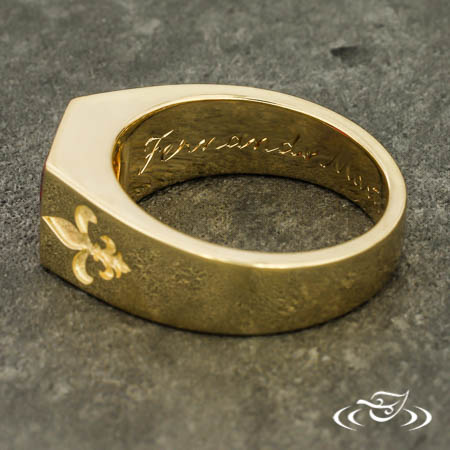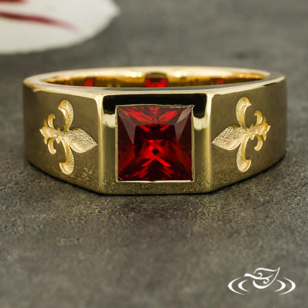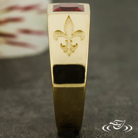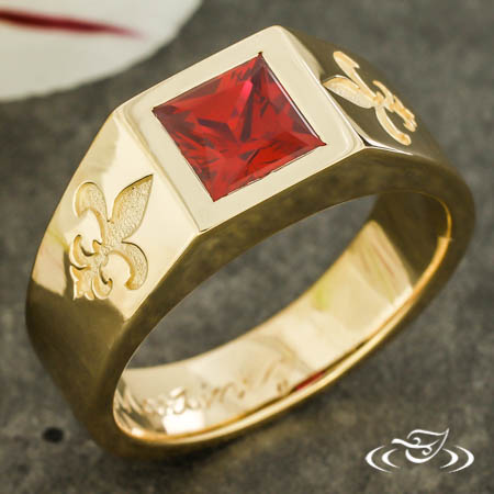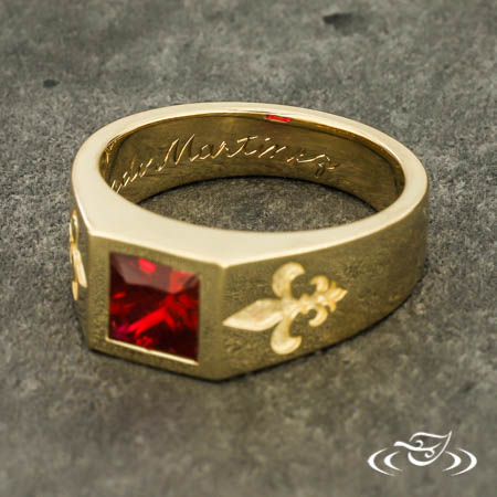 Custom 14kt yellow gold ring holding (1) flush set GLJW provided princess lab ruby center stone. Each shoulder features CAD-and-cast recessed fluer-di-lis motifs with stipple texture. Interior features hand engraved script font "Fernando Martinez". This ring also has a round, straight-taper shank, flat profile, and a high polish finish.