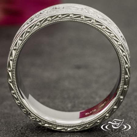 Custom 950 platinum comfort-fit band. Hand engraved with a swirl and hummingbird pattern in the central ~5mm section of the top face with reverse milgrain on each side, followed by (2) blank ~.75mm sections. This band also has ~.75mm beveled edges with a hand engraved geometric motif and milgrain on the inside edge, all with a high polish finish.