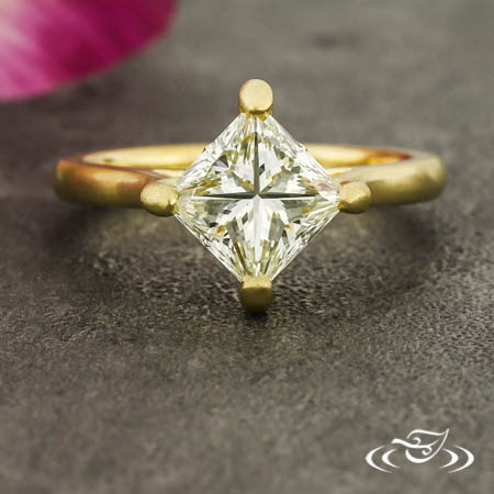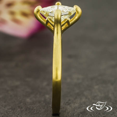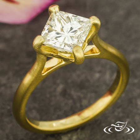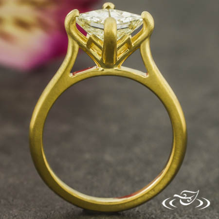 Custom 18kt yellow gold ring holding (1) customer provided princess diamond center stone 4-prong set in kite orientation. This ring also has a round, straight-taper shank, slightly domed profile, and allover matte finish.