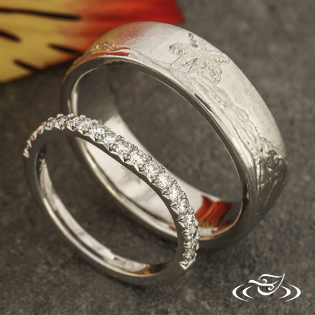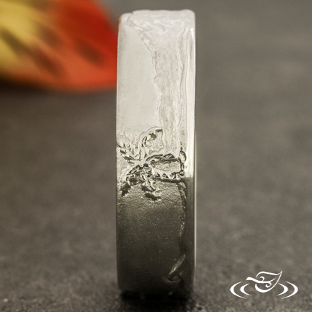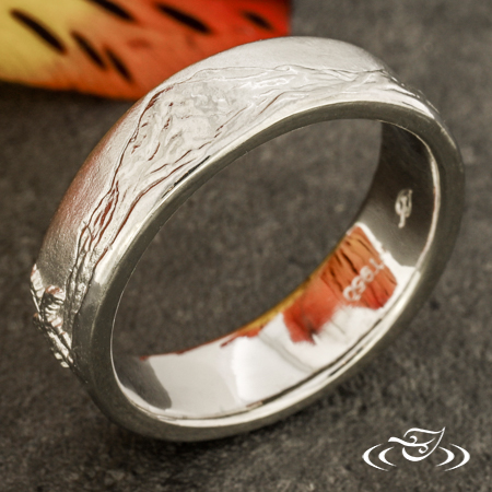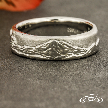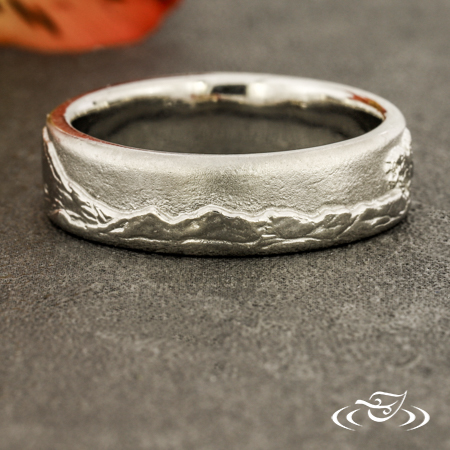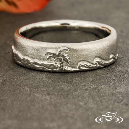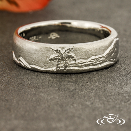 Custom 950 platinum band with round shank and flat profile. Top face features raised, high polish mountains, waves, and palm trees with matte, recessed sky.
