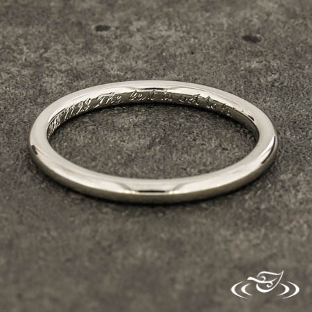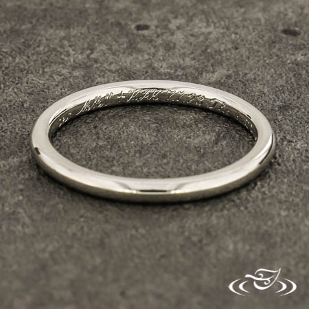 Ordered 950 platinum band with round shank, slightly domed profile, and high polish finish. Interior features hand engraved script font "MMN + KJK 7.7.23 The best is yet to be".