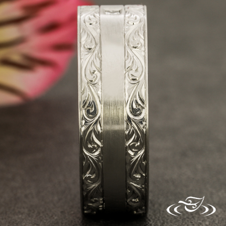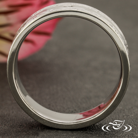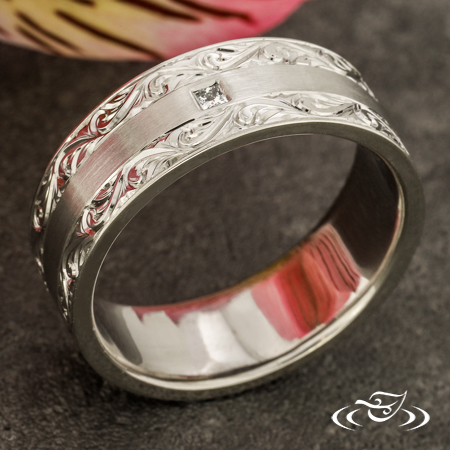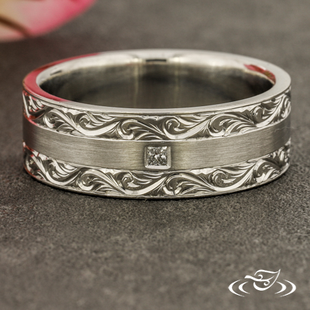 Custom 950 platinum band with round shank and flat, comfort fit profile. Center has matte finish and rails feature bright cut hand engraved scroll motifs eternity style. Side faces are high polish. (1) GLJW provided princess cut diamond melee is flush set in center of matte area.