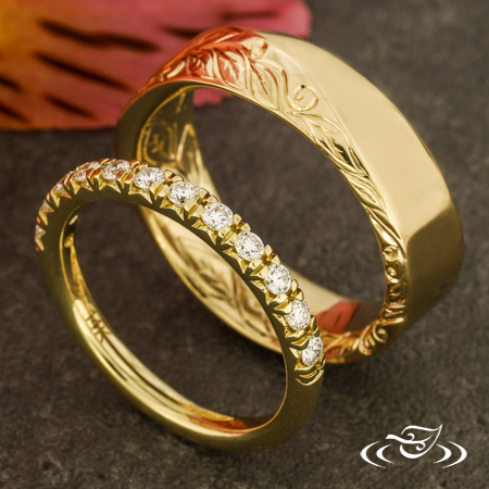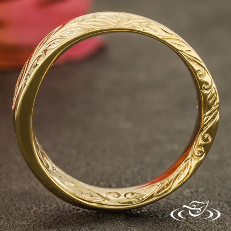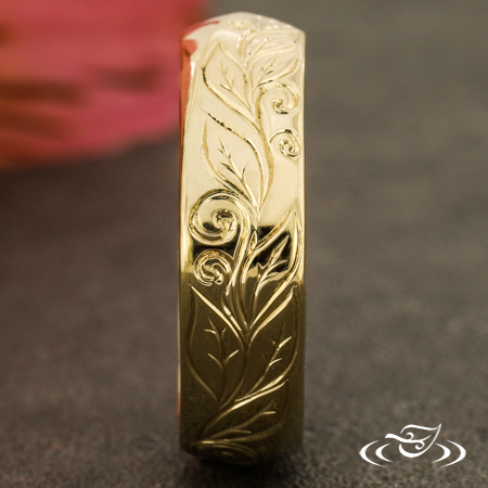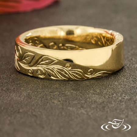 Custom 14kt yellow gold Mobius twist band with round shank, flat profile, high polish finish, and hand engraved leaf and vine motifs on (1) twist.
