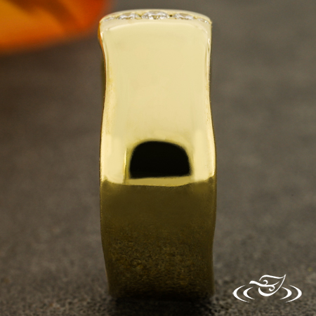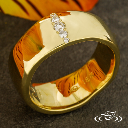 Custom 18kt yellow gold comfort-fit band with (5) vertically set GLJW provided round lab diamonds bead set on the top face, tapering in size. This band also has a shank with organic edges and a high polish finish.