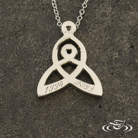 Custom 14kt white gold knot pendant holding (1) bezel set GLJW provided round blue sapphire. This pendant also has a 1.1mm cable chain, 18". Hand engraved on the back in script: 1998 2023.
