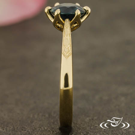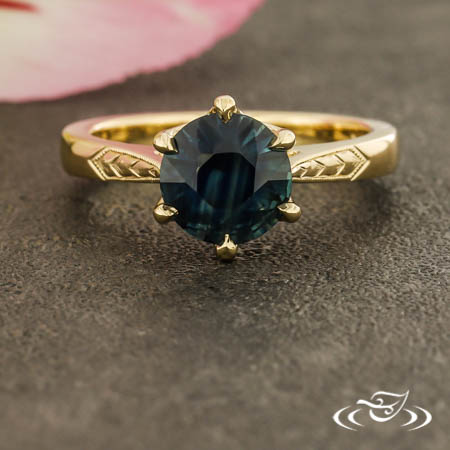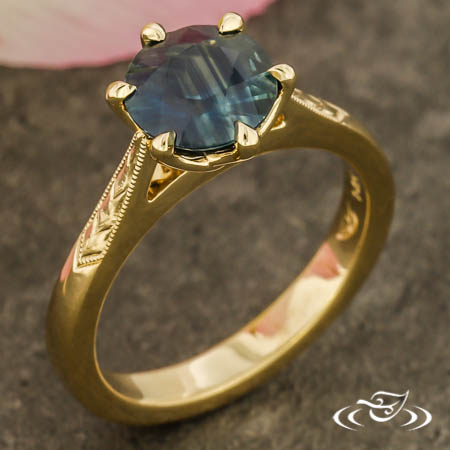 Custom 14kt yellow gold ring holding (1) 6-prong set GLJW provided round sapphire center stone in pierced setting. Each shoulder features hand engraved wheat motifs surrounded by fine milgrain detailing. This ring also has a round, reverse-taper shank, slightly domed profile, and a high polish finish.