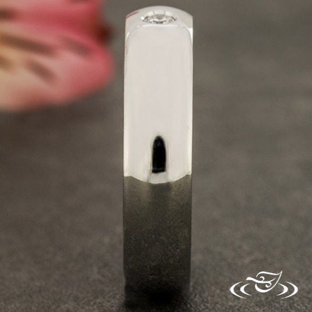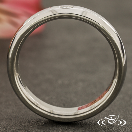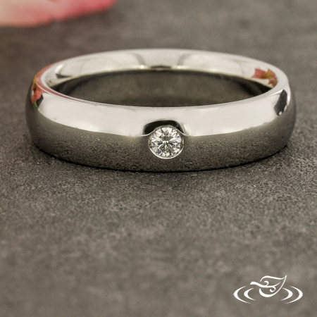 Custom 950 platinum band holding (1) GLJW provided round diamond center stone flush set on center top face. This band also has a round shank, slightly domed heavy comfort fit profile, and a high polish finish.