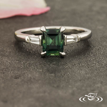 Custom 950 platinum ring holding (1) 4-prong set GLJW provided baguette sapphire center stone flanked by (2) GLJW provided tapered baguette lab diamond melee channel set. This ring also has a round shank, slightly domed profile, and a high polish finish.