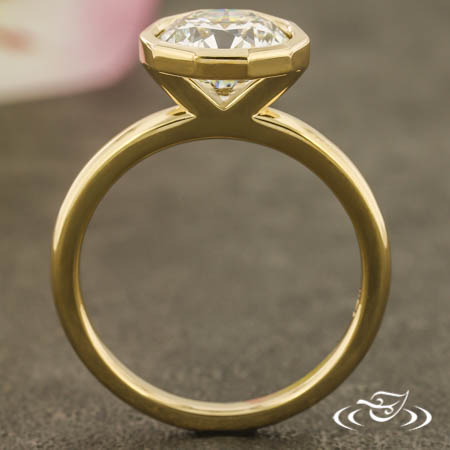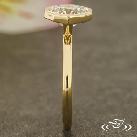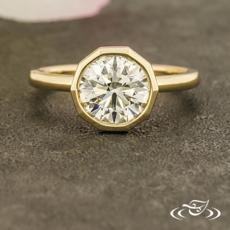 Custom 14kt yellow gold ring holding (1) bezel set customer provided round diamond center stone in decagonal shaped setting. This ring also has a round shank, slightly domed profile, and a high polish finish.
