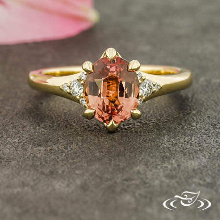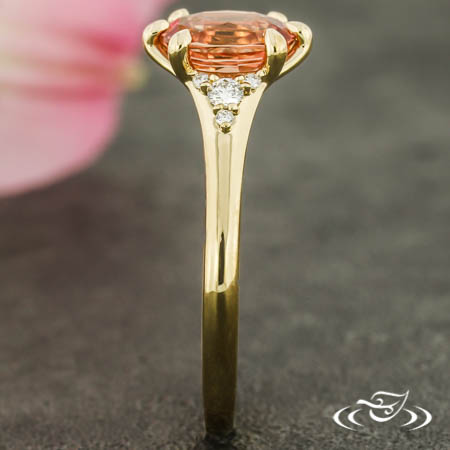 Custom 14kt yellow gold ring holding (1) 6-prong set GLJW provided oval peach sapphire center stone. Each shoulder features (4) GLJW provided round diamond melee shared-prong set. This ring also has a round, curve-taper shank, slightly domed profile, and a high polish finish.