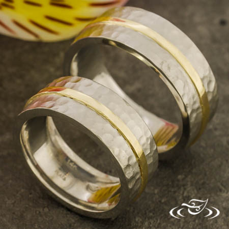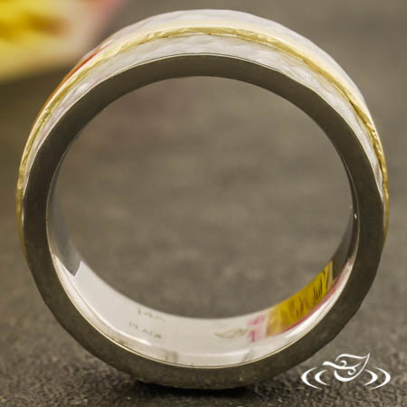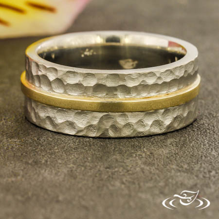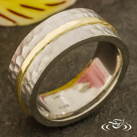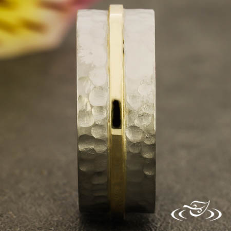 Custom 2-tone band featuring matte, hammered texture platinum base with raised high polish 14k yellow gold inlay in center. This band also has a round shank and flat profile.