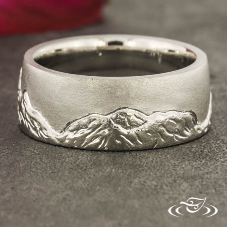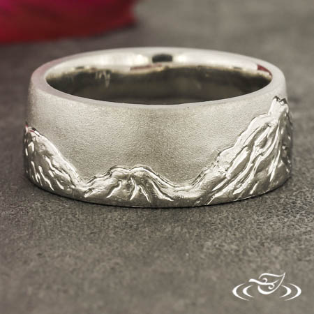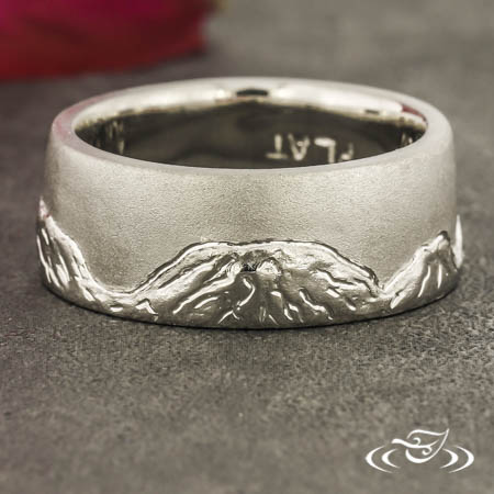 Custom 950 platinum band featuring carved-and-cast mountains on the top face with hand engraved details: Mt. Stuart, Mt. Shuksan, Colchuch, and Dragontail. This band also has a round shank, a sandblast finish sky, and a mix of matte and polished details on the mountains.