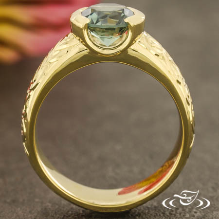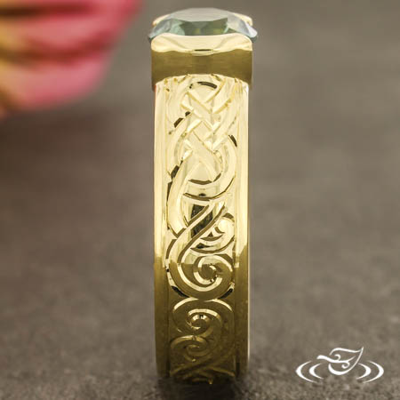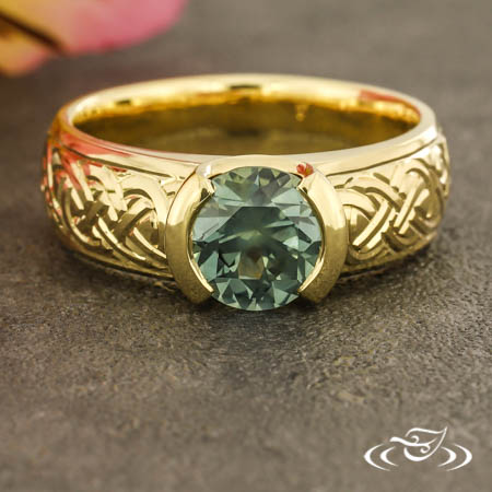 Custom 18kt yellow gold ring holding a half bezel set GLJW provided round sapphire center stone. Hand engraved with a Celtic knot and scroll motif on the top face, eternity style. This ring also has a round shank and a high polish finish.