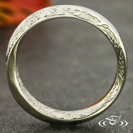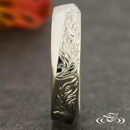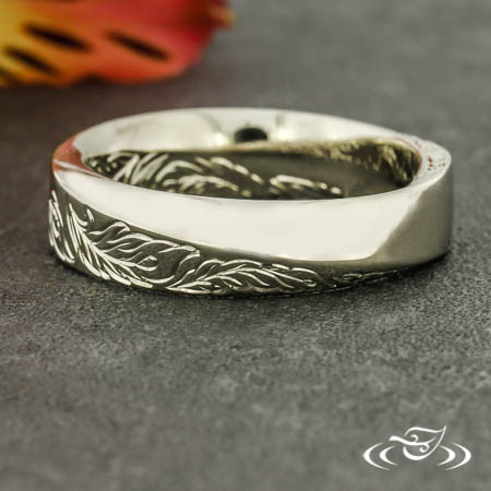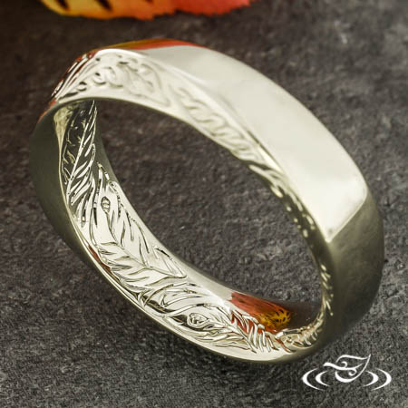 Custom 14kt white gold mobius style band featuring hand engraved feather motif on (1) side of twist. This band also has a round shank and a high polish finish.