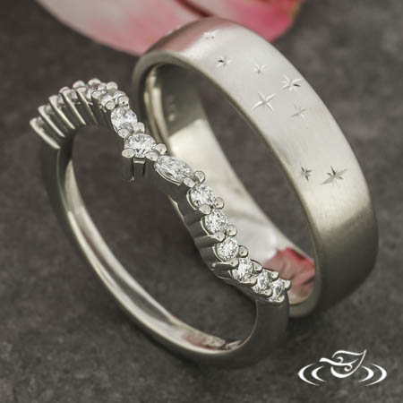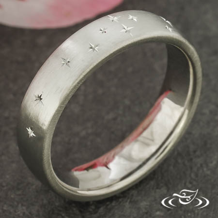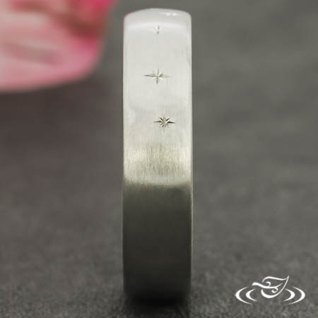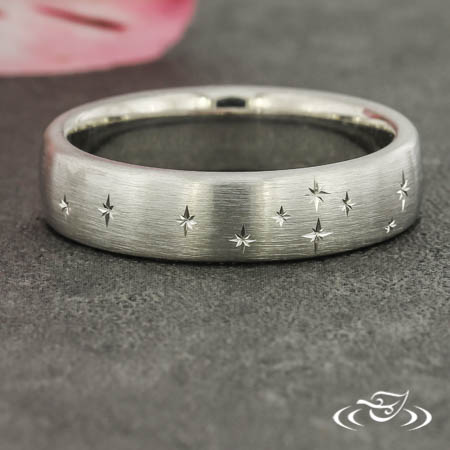 Ordered 950 platinum band with round shank, European comfort fit profile, and a matte finish. Top face features hand engraved star patterns matching layout of stones on GLJW made engagement ring.