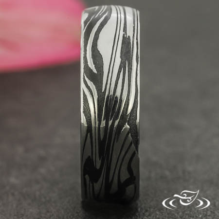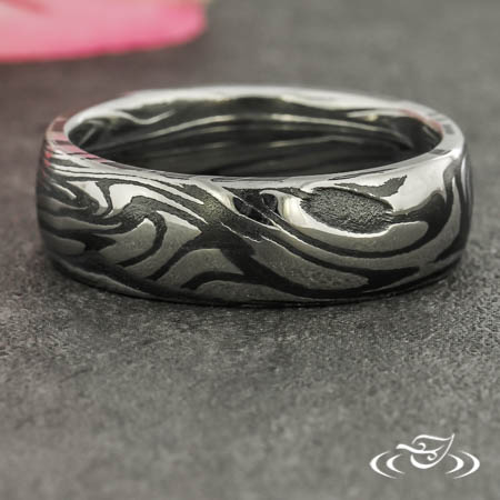 Ordered Damascus steel Lashbrook band with round shank, slightly domed profile, and acid etched finish.