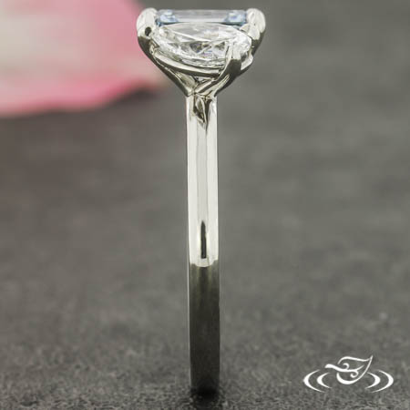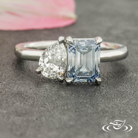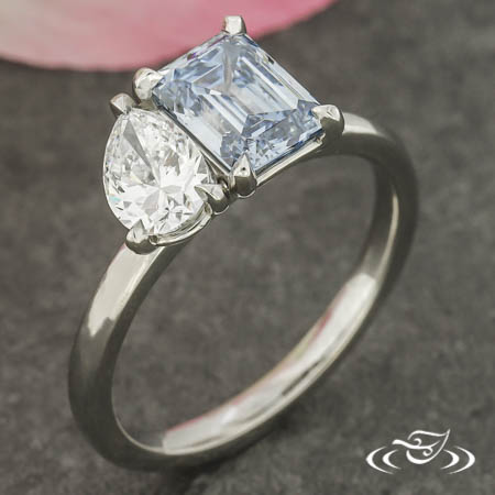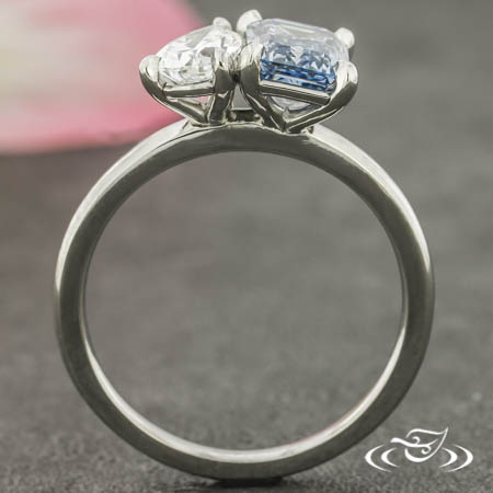 Custom 950 platinum Toi et Moi ring holding a 4-prong set GLJW provided emerald cut lab diamond center stone and (1) GLJW provided pear lab diamond stones on top face. This ring also has a round shank and a high polish finish.