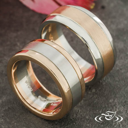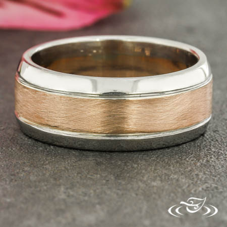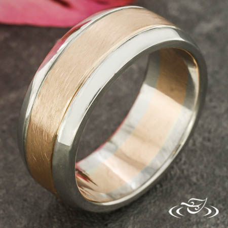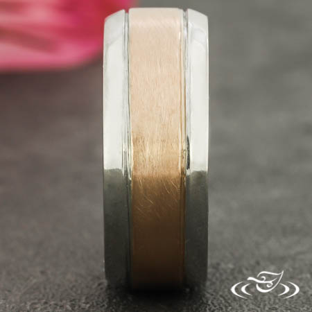 Custom band with round shank, flat profile, matte 14k rose gold center, and high polish platinum beveled rails. Metals are separated by hand engraved grooves eternity style.