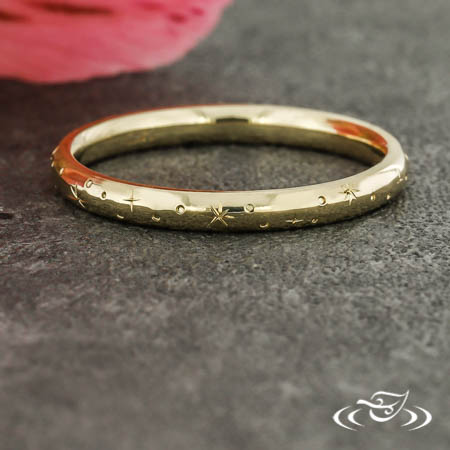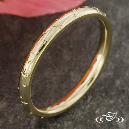 Custom 14k yellow gold band with round shank, slightly domed profile, and high polish finish. Top face features hand engraved stars in scattered orientation.