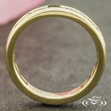 Custom 14kt yellow gold band featuring (13) GLJW provided baguette lab diamond melee channel set on top face. This band also has a round shank, flat profile, and a high polish finish.