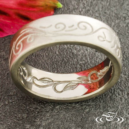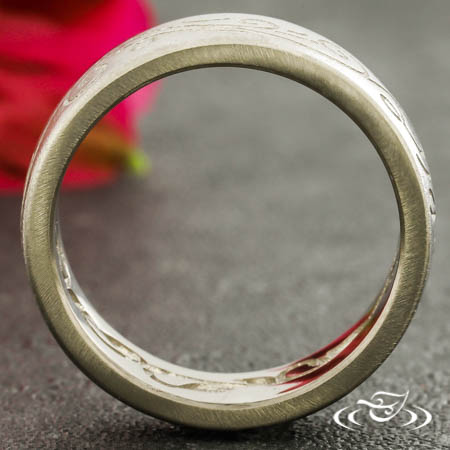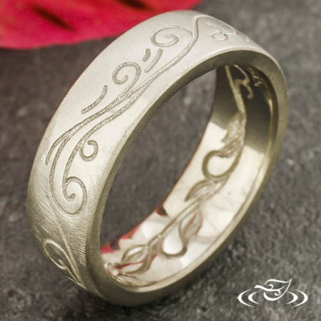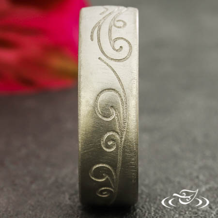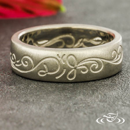 Custom 18kt palladium white gold band with round shank, slightly domed profile, and a matte finish. Top face and interior both feature recessed scrolls and curls eternity style.