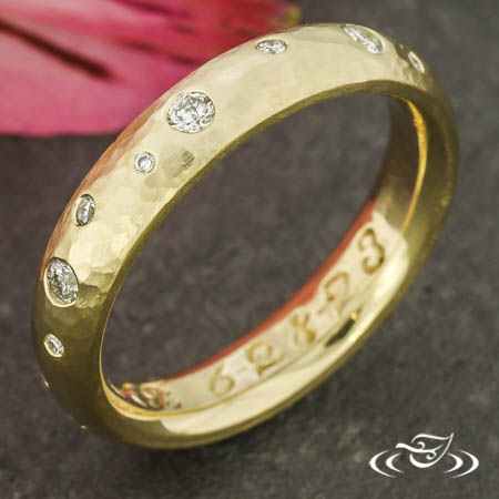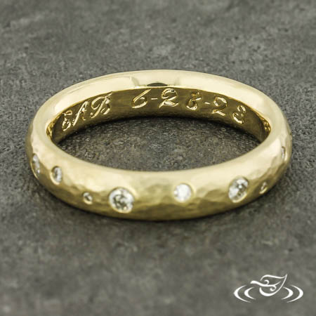 Custom 14kt yellow gold band featuring (11) GLJW provided round lab diamond melee and (7) customer provided round diamond melee flush set in scattered orientation on top face. This band also has a round shank, slightly domed profile, and a matte finish. Interior features complimentary hand-engraved script font "EAB 8-28-23".